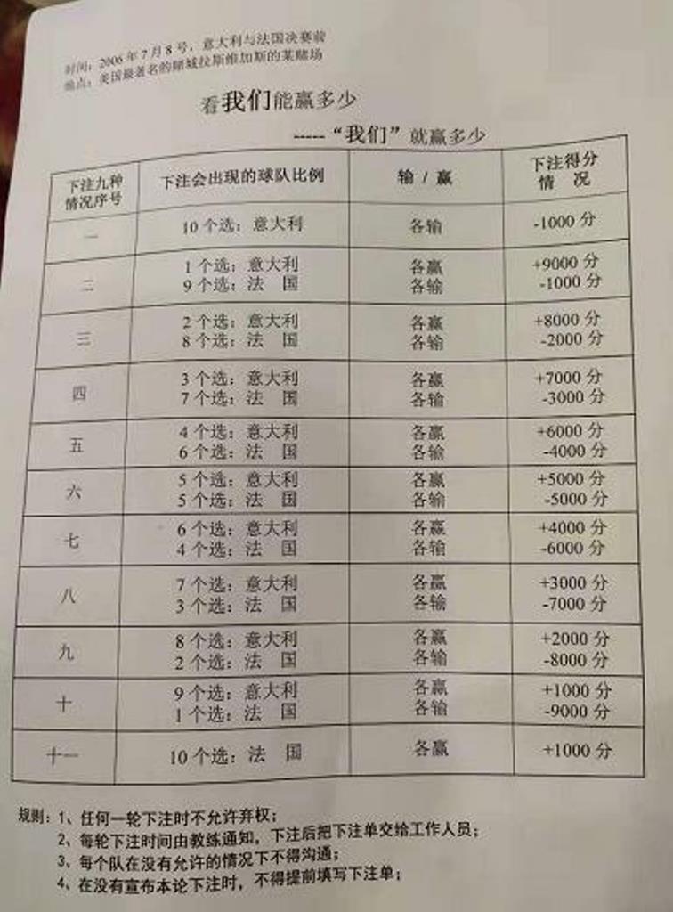 人員介紹完成后我們進(jìn)行了不少的互動(dòng)游戲,例如進(jìn)場(chǎng)時(shí)間、拍肩膀,做按摩,抓手指,這些活動(dòng)作為開胃小菜真的很令人開心,但是開心過后重頭戲來了,就像平時(shí)領(lǐng)導(dǎo)擰螺絲一樣,松松筋骨是為了迎接更強(qiáng)烈的疾風(fēng)——項(xiàng)目投資之拉斯維加斯,規(guī)則很簡(jiǎn)單,十個(gè)小組,兩個(gè)隊(duì)法國、意大利賭球,團(tuán)隊(duì)利益大于一切,最后我們小組的分?jǐn)?shù)為負(fù)26W,我們虧了,但是我們卻止損了,虧了我們的,減少了整個(gè)團(tuán)隊(duì)的損失,用我們小組的話來說,雖敗猶榮!