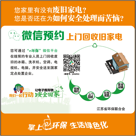 該微信服務(wù)平臺是由江蘇省環(huán)保聯(lián)合會主辦,南京凱燕電子協(xié)辦(被江蘇省環(huán)保廳指定為“e環(huán)保·易回收”電子廢棄物回收處置單位),由江蘇省環(huán)保廳2015年6月2日正式發(fā)布。這個項目使廢舊家電的線上回收和線下處置融為一體,是打造電子廢棄物綠色循環(huán)的“O2O”模式。